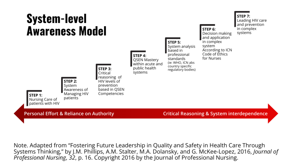 One way of teaching systems thinking that can be incorporated into nursing curricula is the System-level Awareness Model, also referred to as SAM. Using SAM, a novice nurse or nursing student who is not thinking in terms of systems advances through seven successive steps of systems thinking growth until step seven is reached – a professional nurse with a strong knowledge of systems thinking, who is prepared to lead in a complex health care environment. The seven steps build on each other, meaning a student or new nurse cannot successfully reach the next step without understanding and demonstrating the attitudes, skills, and behaviors of the steps below it. Because of the progressive nature of this model, it can be introduced into the curriculum at the start of a nursing program and then used throughout the program in beginner, intermediate, and advanced classroom, clinical, and simulation environments (Phillips & Slater, 2016). SAM incorporates the Quality and Safety Education for Nurses (QSEN) competencies in steps three and four because systems thinking plays a critical role in the successful adoption and application of the QSEN competencies (Phillips et al., 2016; Dolansky & Moore, 2013). As students progress, they reduce the amount of personal effort they put into systems thinking, become less reliant on authority figures, increase critical reasoning, and increase their awareness of interdependence. The SAM is presented below as adapted for HIV education. However, it can be used for any nursing concepts of interest or patient problems.